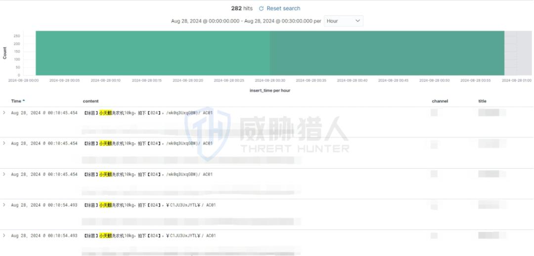 日常的威胁情报挖掘与监测也成为重点。比如在“小天鹅”店铺遭遇的黑灰产攻击中,威胁猎人情报平台排查发现,2024年8月28日00:10至01:30期间,监测到的小天鹅相关情报激增。其中,8月28日00:10:45,羊毛群组“可***4群”发布了与小天鹅相关的低价羊毛广告。00:10:45至01:22:45期间,共捕获77个不同羊毛群组发布的与“小天鹅洗衣机低价羊毛”相关羊毛情报共290条。