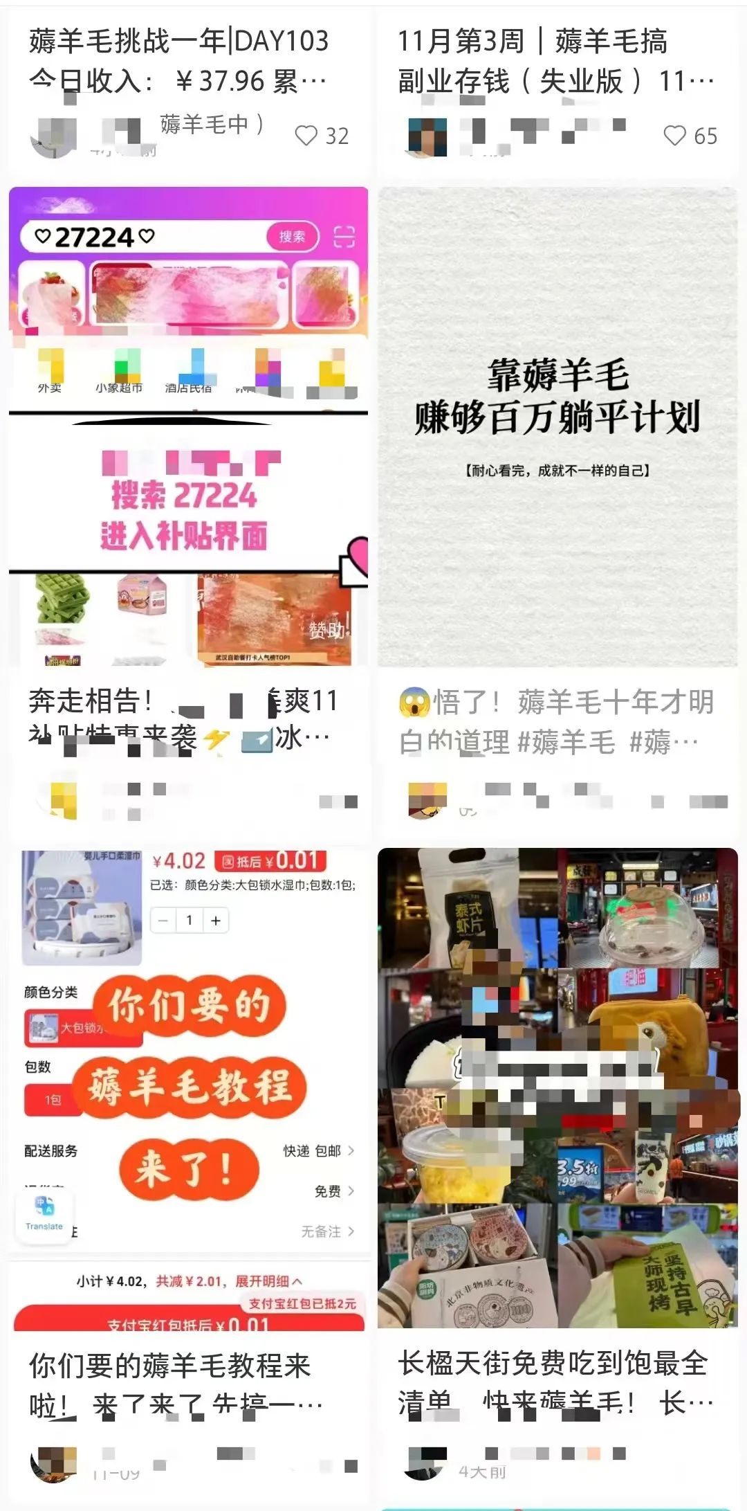 “薅羊毛”实际上早已成为口口相传的“生财之道”。只要你搜索关键词“薅羊毛”,就能看到各种教程:“靠薅羊毛赚够百万”“薅羊毛月入5K”“薅羊毛实操教学”等,也会有群聊链接,分享薅羊毛信息。有的群直接售卖优惠信息,每单数十元不等,薅羊毛成功后也会在群内晒单。
