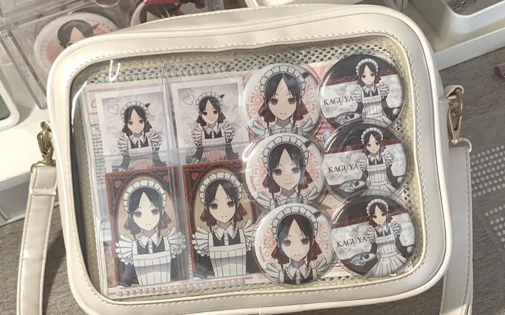 “痛包”作为展示谷子的装备,是一个挂满徽章和玩偶及周边的包,包外侧透明夹层用来展示各式各样的谷子。