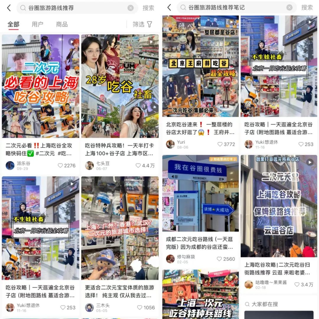 比如,在小红书平台上搜索“谷圈旅游路线推荐”,笔记数量高达607万+篇,频率最高的城市包括北京、上海、成都、广州、香港等二次元产业发达的城市。将“吃谷”列为旅游清单之一,已经成为二次元圈内人的日常。