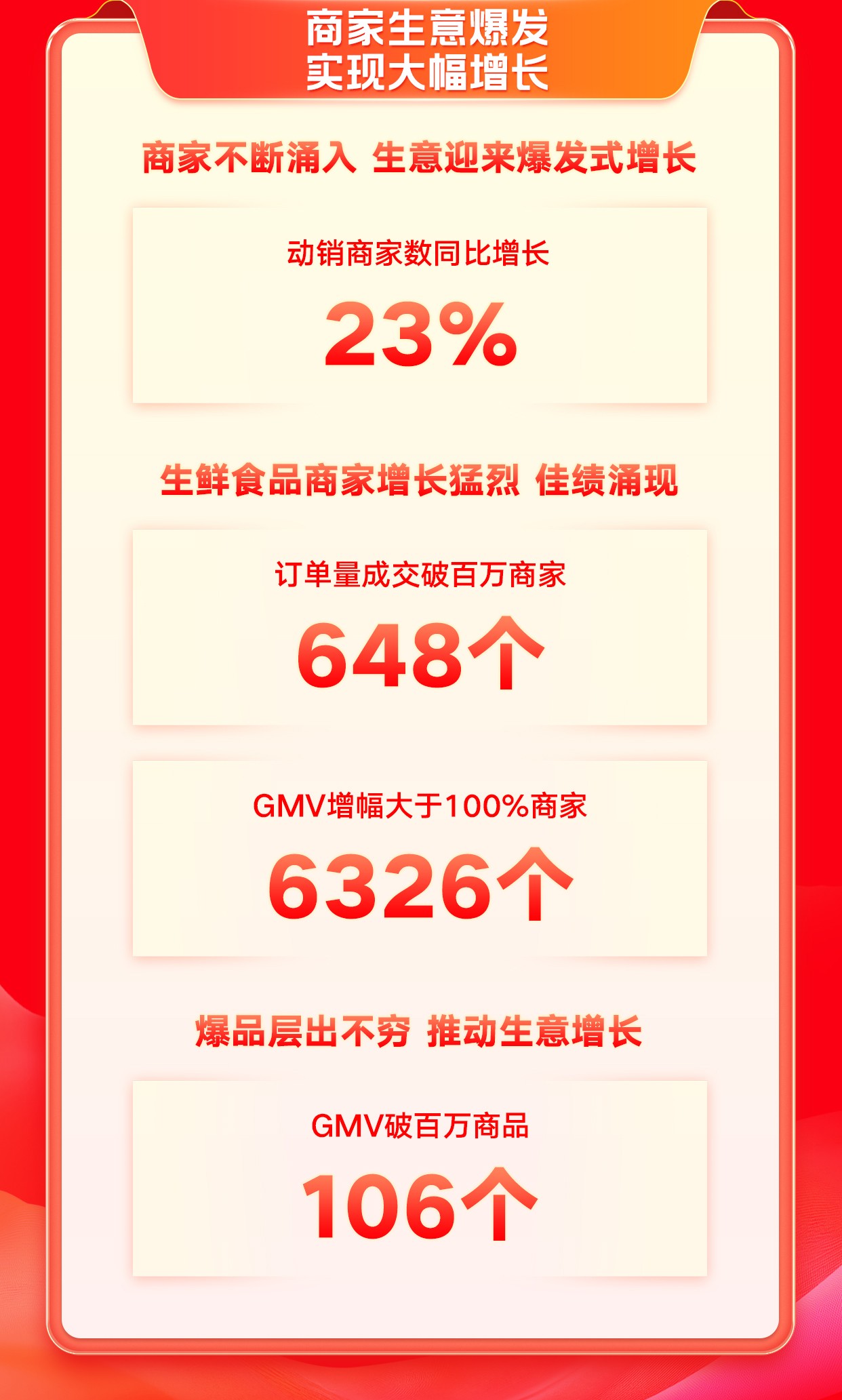 快手电商数据显示(10月19日—10月24日),快手电商生鲜食品行业动销商家数同比去年同期增长23%,其中GMV增幅超100%商家数达6326个,订单量成交破百万商家数达648个,包括蒙牛、鲁花、白象等一线品牌。