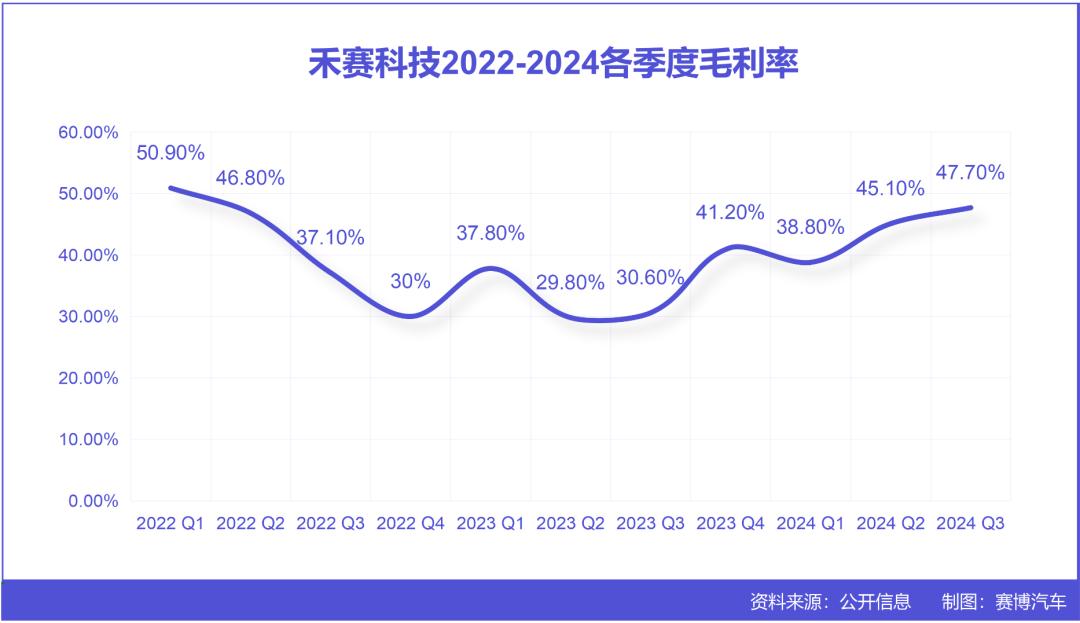 所以禾赛第三季度的毛利率进一步增长至47.7%,较去年同期的30.6%增加了17.1个百分点。同时这也是禾赛科技自2022年第二季度以来的毛利率水平最高点。