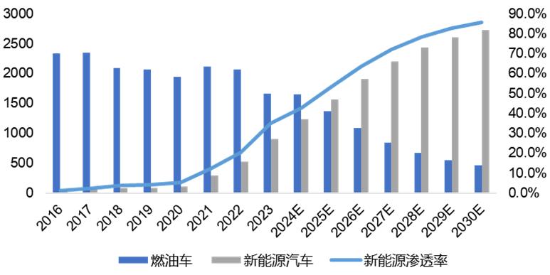 图 3 我国新能源汽车及燃油车市场销量预测,资料来源:汽车工业协会,车百智库测算