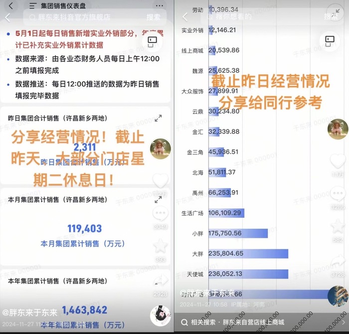 11月27日,胖东来董事长于东来在其同名抖音账号上披露出胖东来本年度最新经营情况。根据他放出的两张截图,截至11月26日,本年度胖东来集团累计销售(许昌新乡两地)已达146.38亿元。
