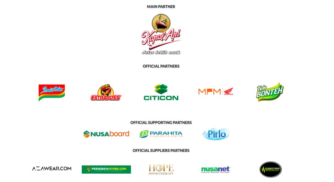 泗水队方面,赞助商级别则相对更加清晰,主要合作伙伴为咖啡品牌Kapal Api;官方合作品牌包括食品品牌Indofood、功能饮料品牌EXTRAJOSS、科技公司Citicon,汽车类品牌MPM以及主赞助商Kapal Api旗下茶饮品牌Teh Bonteh等四个层级共计14个品牌。