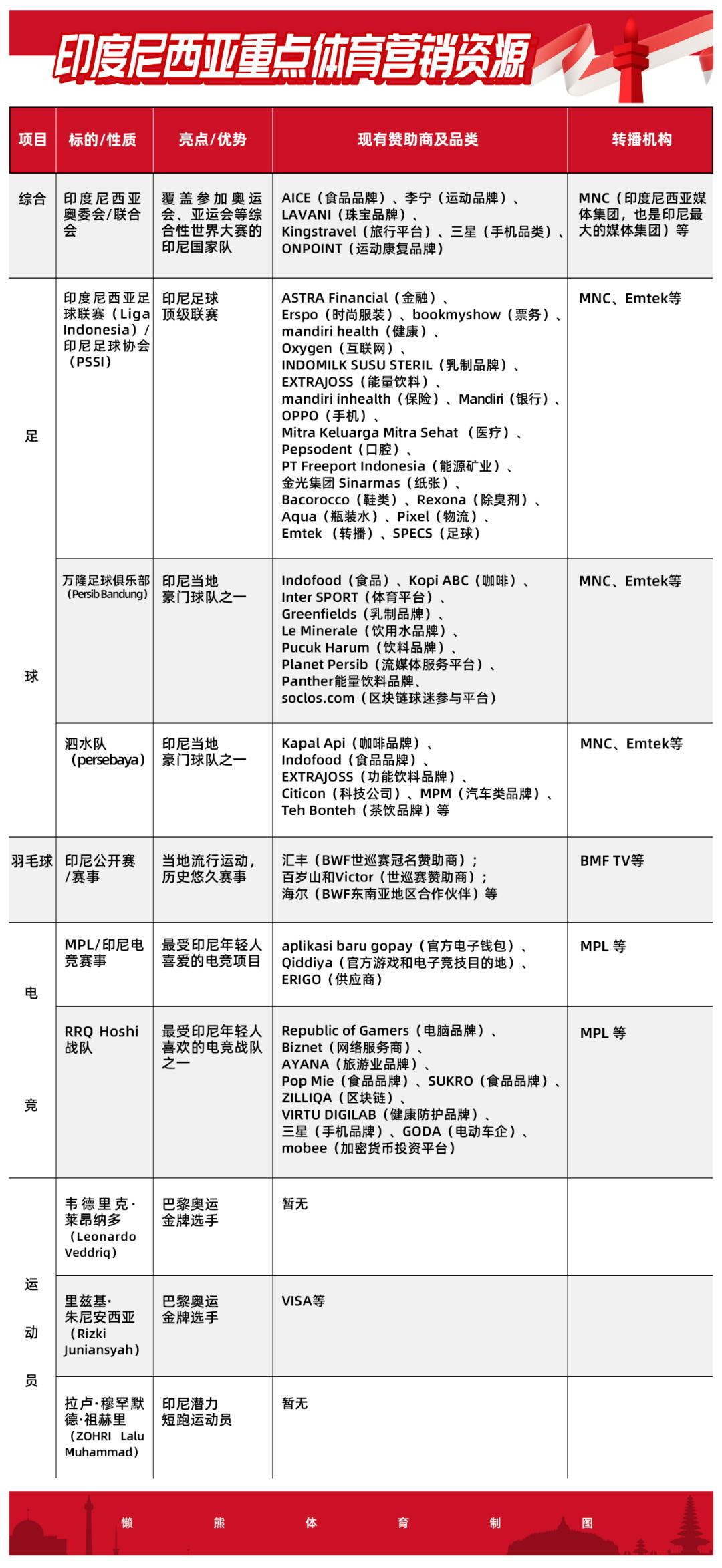 我们也将上述的印尼相关重点体育营销资源放到一张图表中,有兴趣者可以查阅收藏。