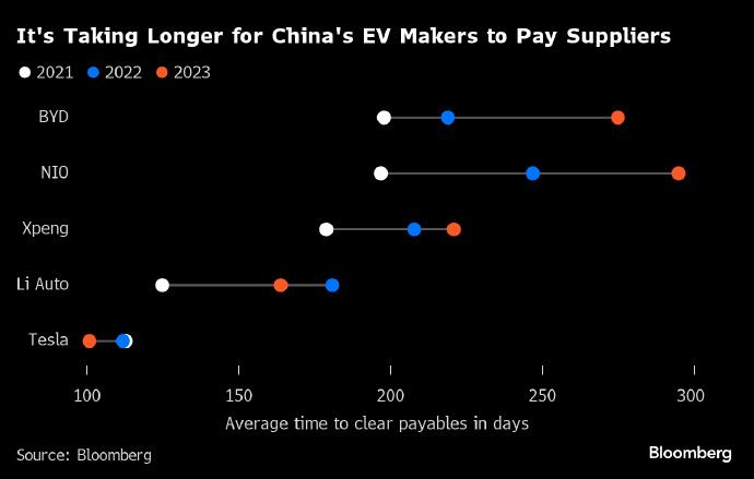 BloombergNEF的一份研报显示,理想2023年的供应商账期有所回落,在比亚迪、蔚来、小鹏这几家中存在优势,也是它们当中唯二缩短了账期的,另一家是特斯拉。