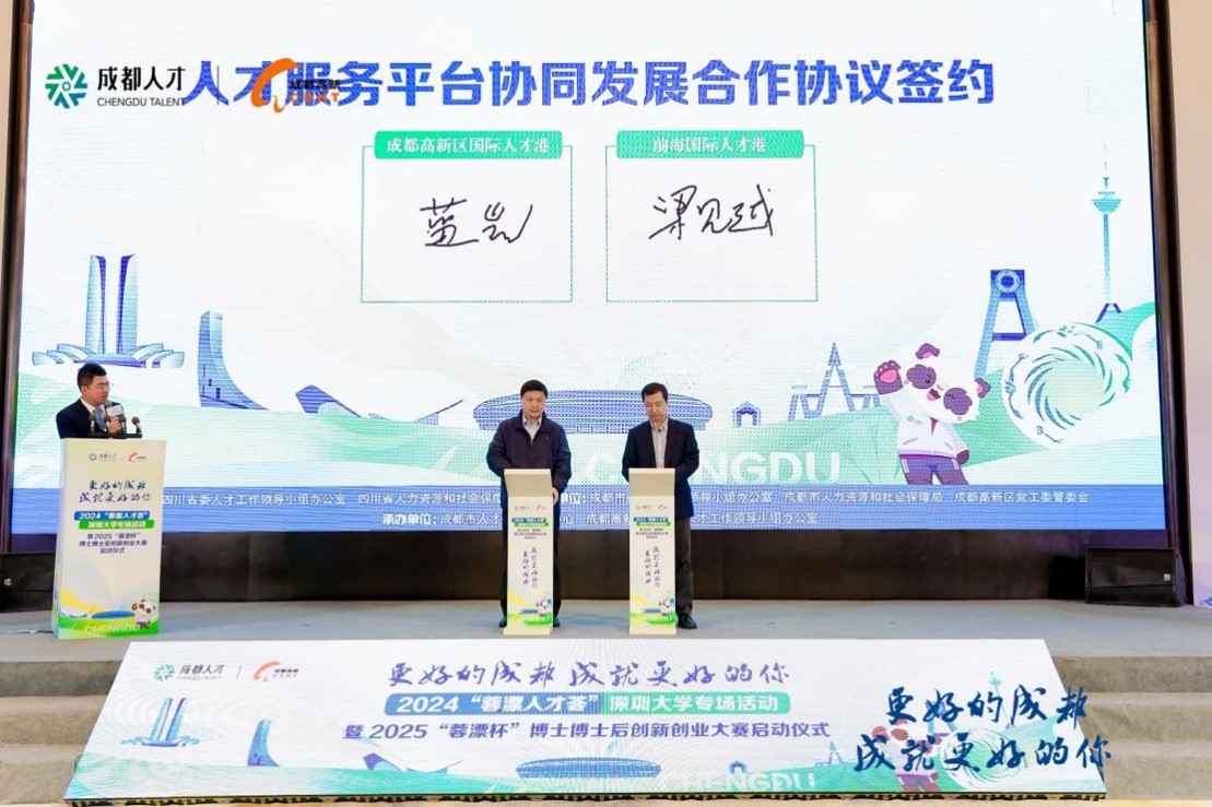 活动现场,2025年“蓉漂杯”博士博士后创新创业大赛正式启动,将面向全球招揽优质项目。同时,活动期间还成功举办了深圳大学专场招聘会,并达成了系列重要项目和合作计划,包括“蓉漂”引才工作站授牌、人才服务平台合作协议签约等。