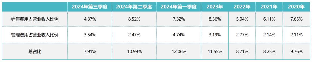 2024年第三季度期间,格力电器的销售费用与管理费用合计占据营业收入的7.91%,低于2020年-2023年的数值水平。