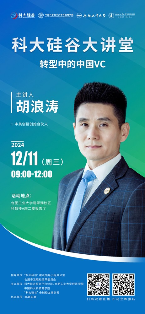 为了深入探讨这些议题,12月11日,科大硅谷大讲堂(第十九期)将走进合肥工业大学,在联合举办经济学院首届金融节的契机下,特邀中美创投创始合伙人胡浪涛先生,以“转型中的中国VC”为主题作深度分享。