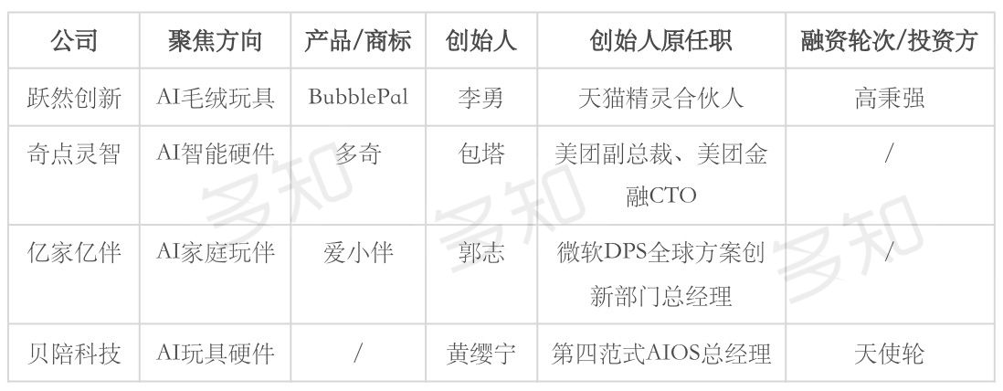 另外,像是小鹏机器人产品设计原负责人孙兆治成立珞博智能,主攻 AI 陪伴机器人。安克创新的谢羽佳则创立三耳猫科技,聚焦儿童 AI 硬件方向,已获得一线风投基金投资。