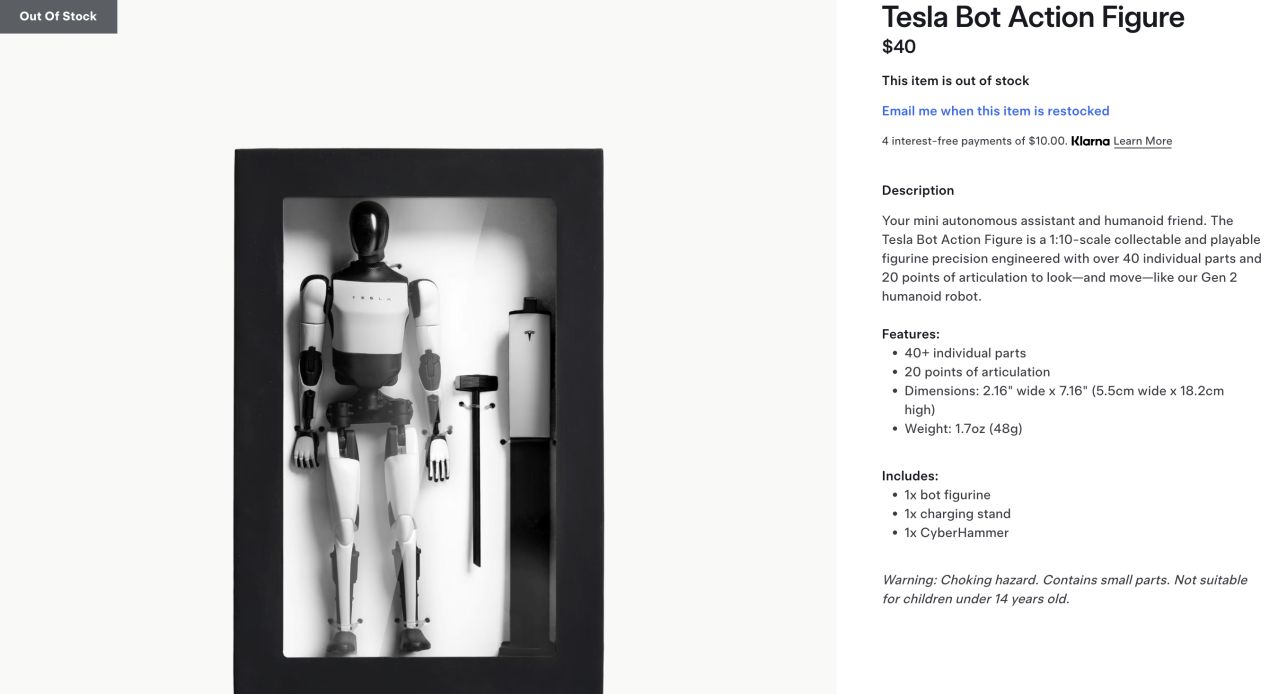 根据外网消息,特斯拉机器人动作玩具上线不到24个小时,就销售一空,甚至网友的热情还把网站挤崩了。很多网友表示,这是唯一能买得起的特斯拉机器人。