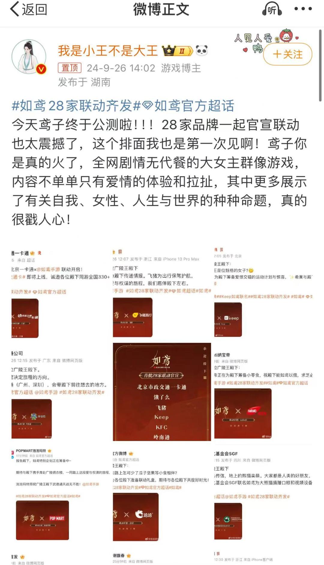 一些“联名崩溃事件”也在玩家的吐槽、路人的惊讶中上了热搜,比如《恋与深空》与肯德基联名开放预约当日,就将#肯德基崩了#送上热搜。而在今年9月《如鸢》公测当日,28家品牌联动官微宣发,从其跨度之大泡泡玛特到北京市政交通一卡通,牌面拉满。只能说,乙女游戏不愧是跨界领域的“时尚单品”。