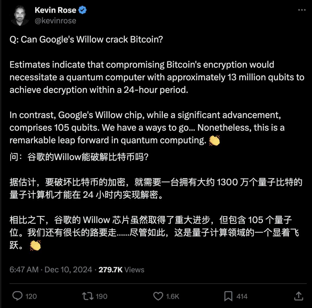 谷歌前高级产品经理 Kevin Rose 发X表示,尽管 Willow 在量子计算性能方面取得了巨大进步,但其能力仍远不足以威胁加密货币的安全性。