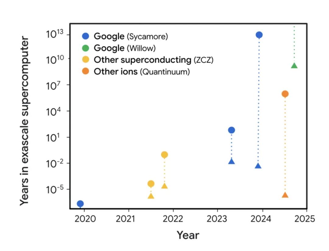 Willow芯片解决了量子计算领域三十年来未攻克的难题,并且在5分钟内完成了当今最快的超级计算机需要10²⁵年(这个数字远远超过了宇宙的年龄)才能完成的计算。