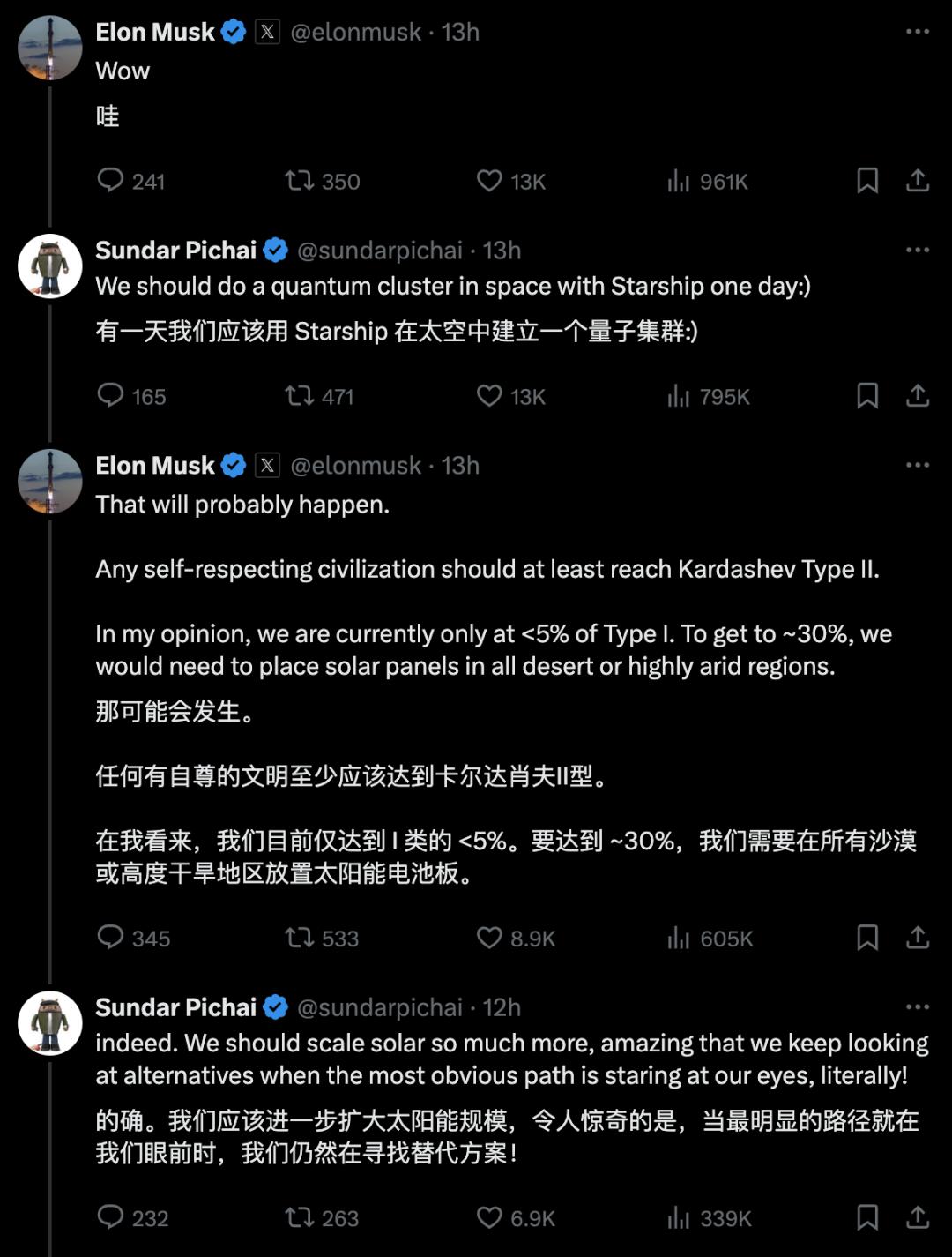 马斯克点赞了Willow,并和谷歌CEO讨论未来量子集群和星舰的合作: