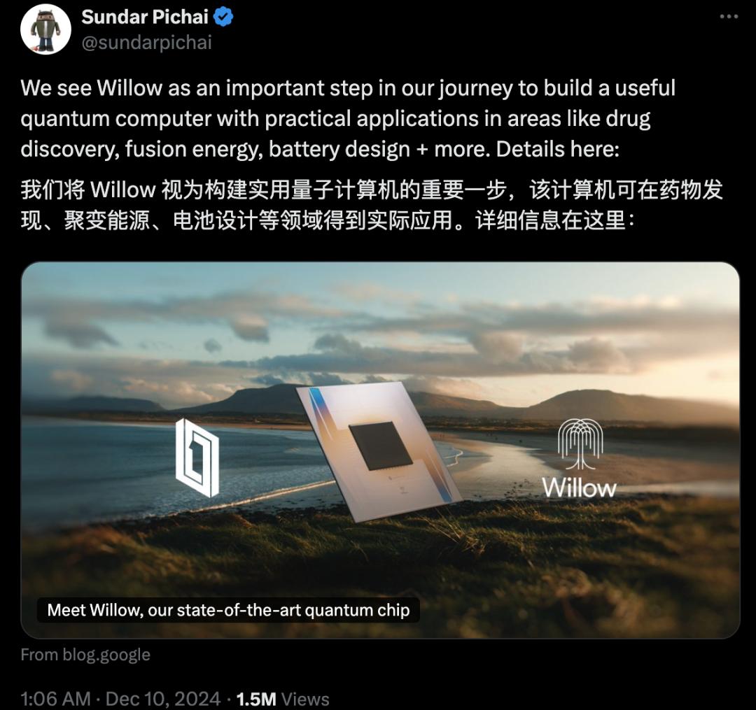 谷歌 CEO Sundar Pichai 在 X 平台发文将 Willow 视为迈向打造实用量子计算机的重要一步。