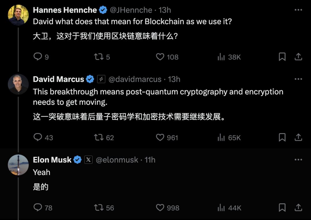在被问到Willow对区块链意味着什么后,David回复到“意味着,量子密码学和加密技术需要开始采取行动进一步发展”,马斯克在下面言简意赅的表示同意。