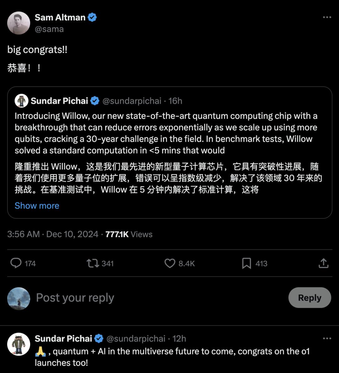 Sam Altman恭喜Google发布Willow,Pichai恭喜OpenAI的o1
