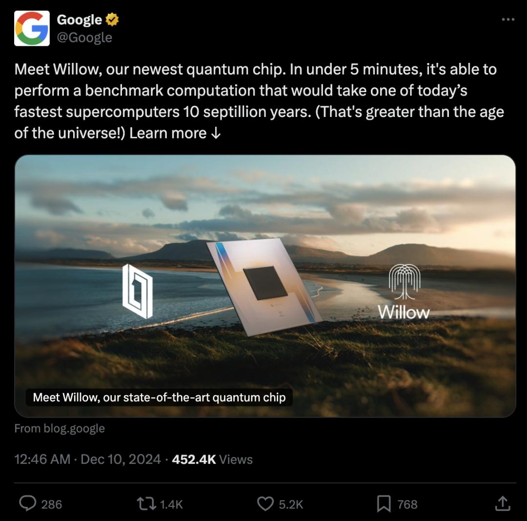 12月9日,谷歌发布最新的量子芯片 Willow,获得了马斯克、奥特曼等一众科技大佬的点赞。