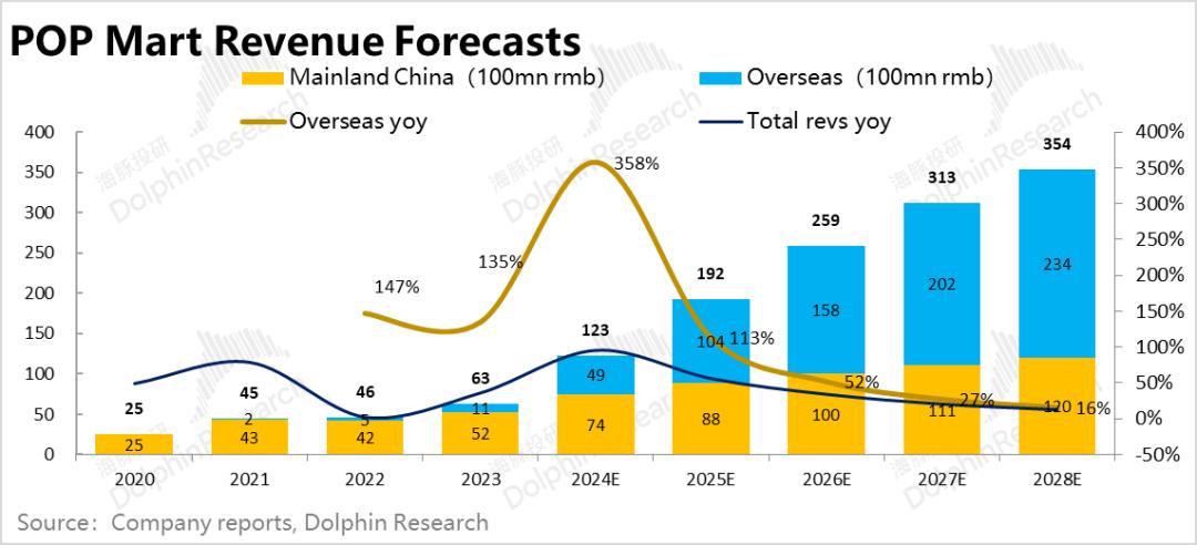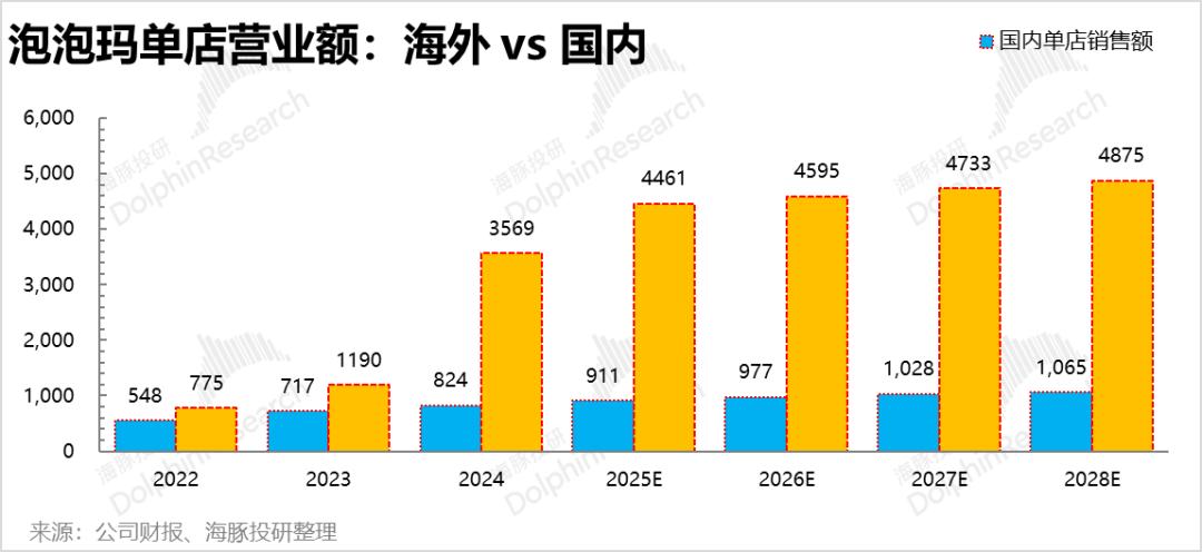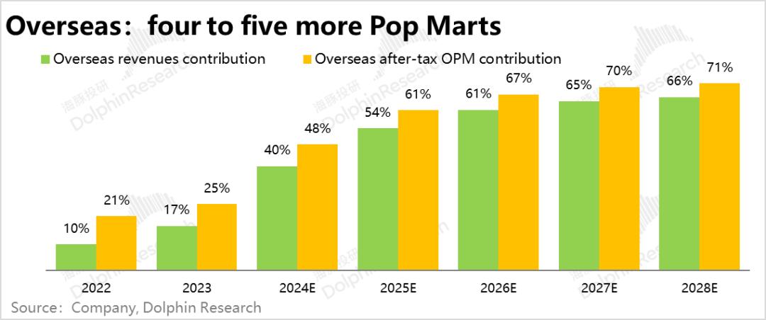 而在单店营业额上,今年下半年单店2500万的营业额(单月合计400多万)与门店铺设量不足有关,这种情况下,海豚君假设2025年单店营业额实际相比今年下半年下行大约10%,之后单店营业额每年仅增3%,单店销售额稍低于乐高(年单店收入4900 vs 5600),也就是增长仅靠开店驱动,单店销售额不驱动增长(对比国内开店稳态之后,每年单店销售额仍能保持稳定大于5%的年化增长,更多开始与产品的品类生命周期相关)。整体对海外市场的假设属中性偏保守。