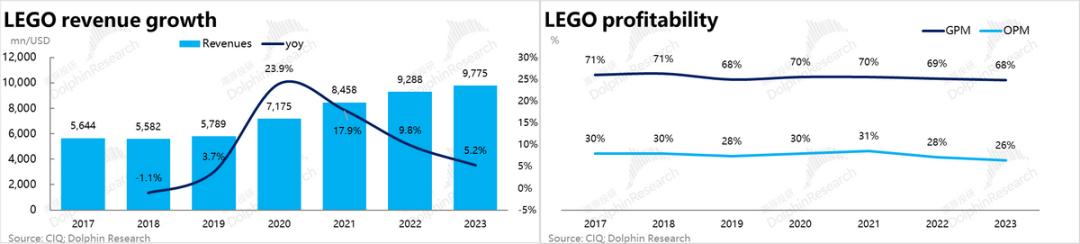 在国际对标上,我们选同样以门店(只是加盟分成)模式推进的丹麦玩具公司——乐高。二者均属于潮玩,且主要业务模式为线下零售开店,毛利率&净利率和泡泡玛特较为相似,60%和20%左右,且公司已经完全成熟。