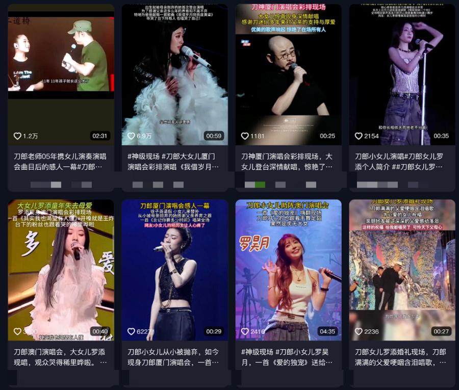 刀郎的“泼天流量”,造就了许多搬运刀郎视频、切片刀郎演唱会的营销号, 在短视频平台随便一搜,你就能看到大量“刀郎女儿”在演唱会献唱的视频:
