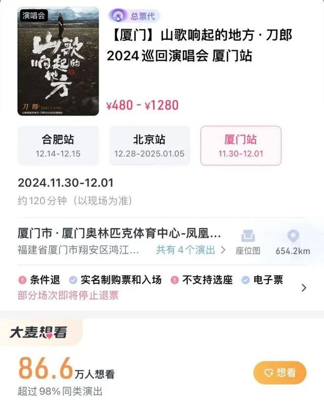 在某票务网站上,还没开票的合肥站,想看人数是73万,刚刚结束的厦门,则有86万人标记想看。