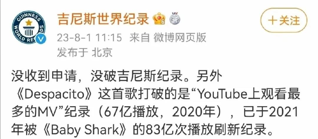 吉尼斯世界纪录曾公开澄清,刀郎的《山歌寥哉》并未申报吉尼斯,当然更谈不上破纪录;