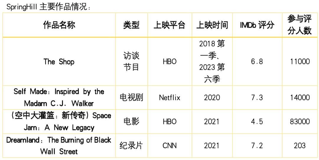 官方资料来看,SpringHill定位为一家多平台的媒体制作公司,致力于打造影响力巨大的影视内容,涵盖电影、电视节目和数字原创内容。自筹划成立以来,SpringHill与多家知名媒体公司合作,不断扩大业务范围,包括在2015年与华纳兄弟达成合作,2020年分别与ABC Studios、Universal和Audible达成电视、电影和播客合作。