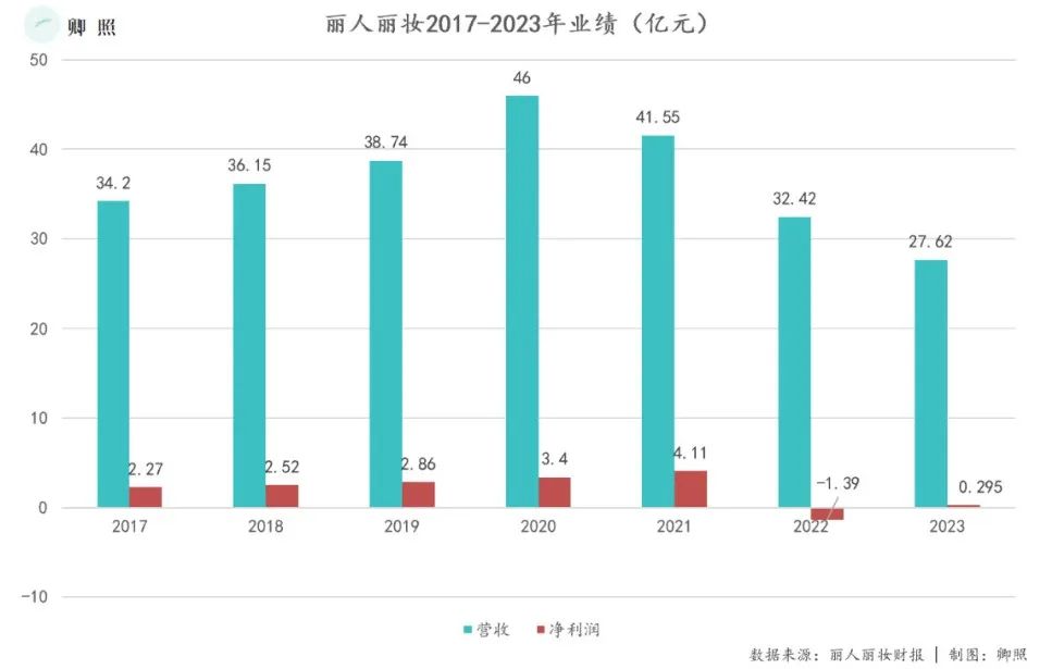 丽人丽妆在刚上市的2020年营收达到顶峰的46亿元,但此后,受淘宝流量红利见顶以及直播电商崛起的影响,业绩开始转头向下,且持续三年之久。2022年更是亏损达1.39亿元,2023年盈利情况好转,但是净利润也仅仅2950万,不到2020年净利润的十分之一。