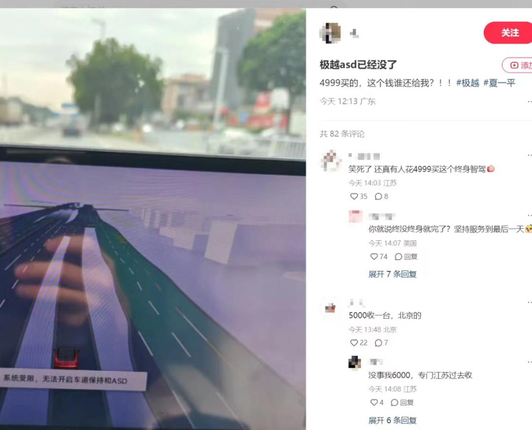 像是 ASD 智驾、文心一言对话大模型,还有 SIMO 智能助手、 OTA 升级,这些功能的使用,没一样离得开互联网。目前已经有车主在某红书上爆料称 ASD 功能已经受限了。