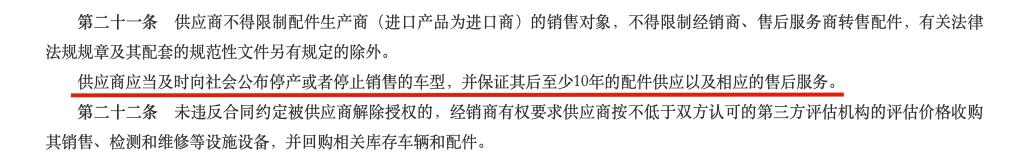 因为它们的破产, 2017 年,商务部发布了《 汽车销售管理办法 》。其中指出: “ 供应商应当及时向社会公布停产或者停止销售的车型,并保证其后至少 10 年的配件供应以及相应的售后服务。 ”