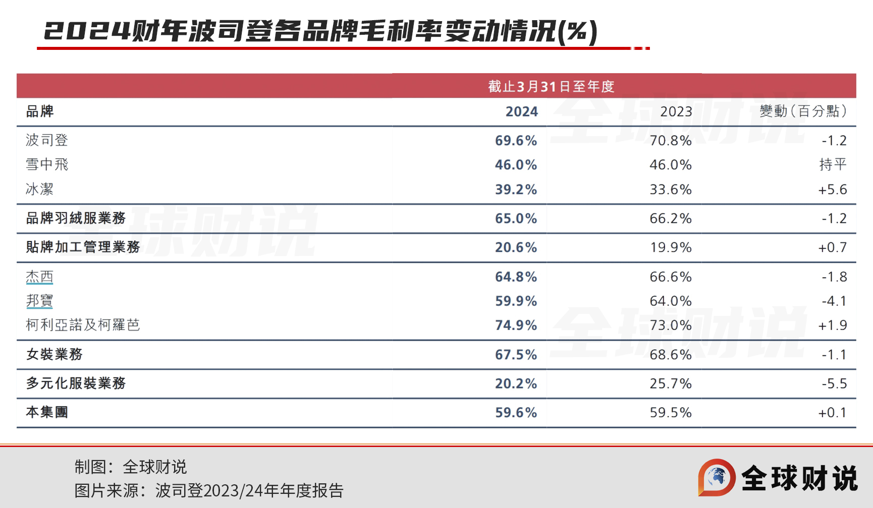 但细分至各业务板块,自2024财年开始,品牌羽绒服业务板块毛利率便出现下滑,同比下降1.2个百分点至65%,其中主品牌“波司登”毛利率同比下滑1.2个百分点至69.6%,是毛利率下降的主要原因。