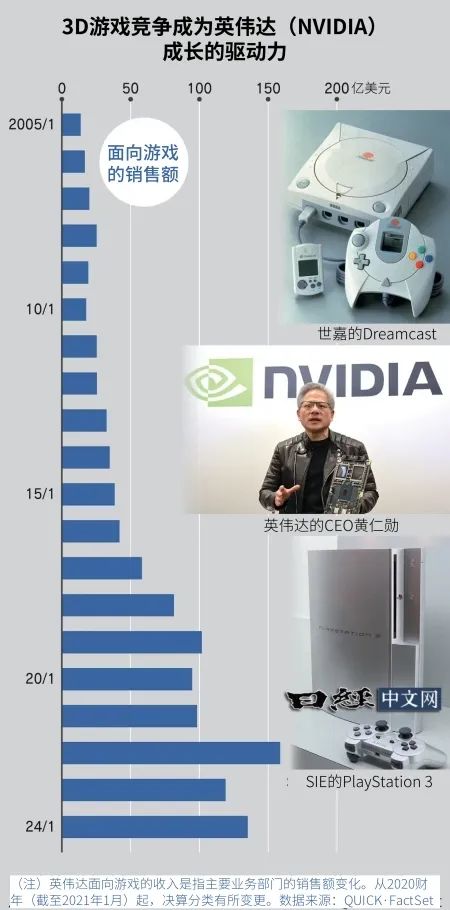 1995年,英伟达为世嘉的家用游戏机“世嘉土星”推出了GPU“NV1”。“PS3”上配备了英伟达与索尼共同开发的GPU。从“PS4”开始则更换成了AMD的产品,但2017年任天堂发布的“任天堂Switch”却采用了英伟达的产品。