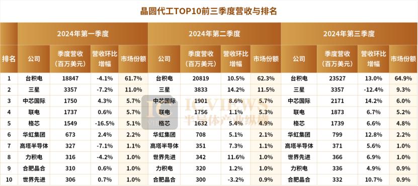 表中透露出来的第一则信息即:今年,前十大晶圆代工龙头大都展现出了显著的复苏势头,其营收呈现出积极的环比增长态势。