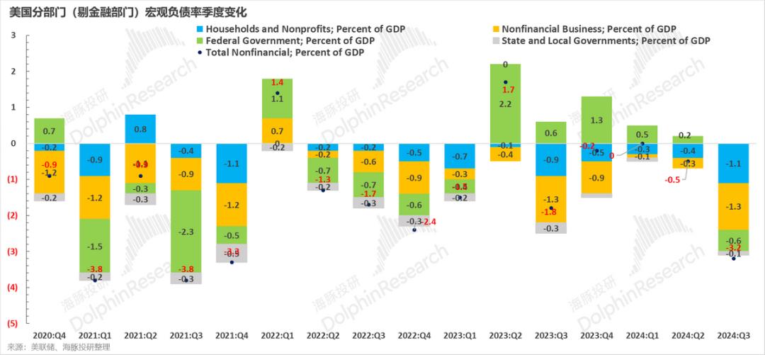 首先宏观负债率上,因为财政收入增加后,美国联邦财政赤字率稳步向下,带动三季度的美国各大经济部门终于全部进入去杠杆状态。