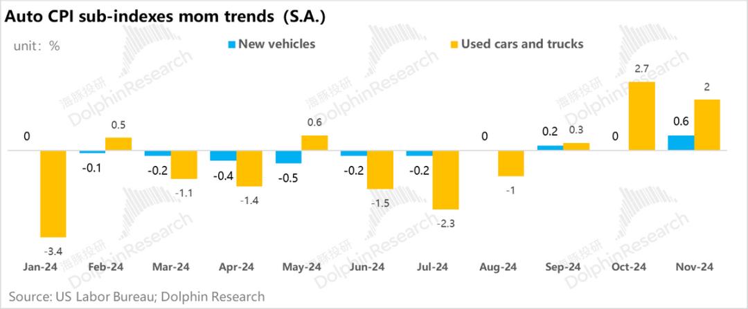 11月贡献边际增长的,反而主要是一直连续通缩了半年的商品:关键的汽车(含新车和二手车,在物价总权重中占比5.4%)是主要物价上涨的类目。其他如烟草、服饰等类目物价也开始缓慢上行。