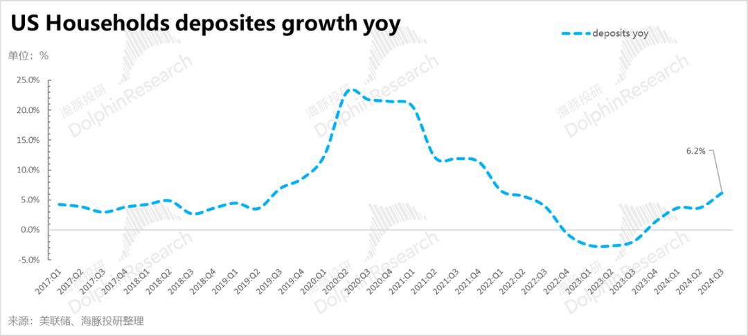 但从居民的资产负债表上一个比较奇怪的地方是,虽然三季度居民部门储蓄率(收入中分配给储蓄的份额,可以是存款或者是理财)占比持续下降,但居民资产负债表上的居民存款额(deposits)不降反增(同比和环比均是如此),而且居民持有的权益资产环比由于股债同涨,还在持续增长中。