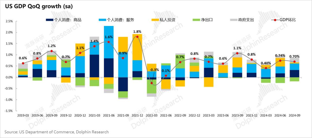 宏观杠杆率降下来了,但是三季度GDP增长并未降速,三季度环比折年还有2.8%的增长,居民的商品和服务消费是仍然是驱动经济增长的核心动力。