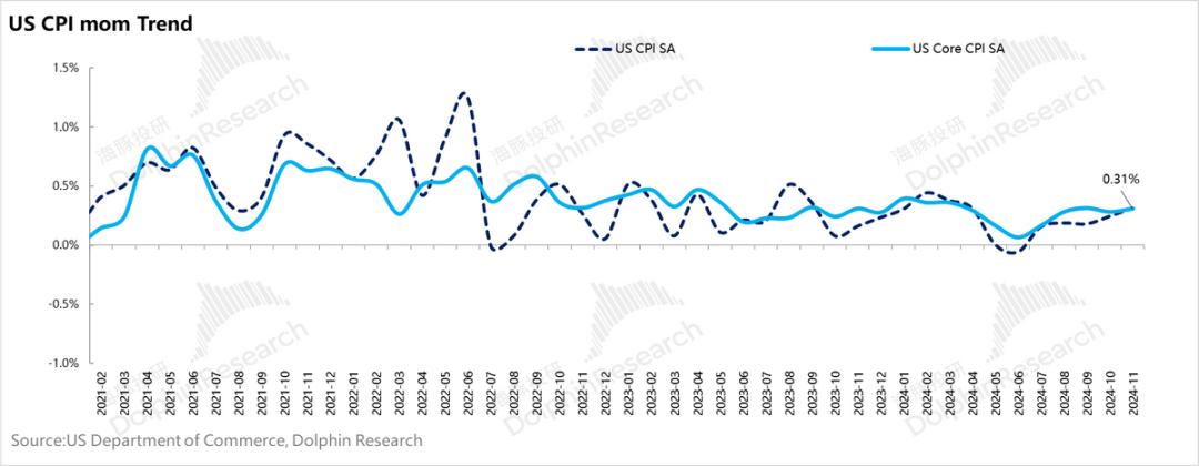 再看经济软着陆过程中的美国最新的通胀进度,11月美国CPI与核心CPI环比增速双双回升到0.31%,而0.25%+的月环比增速指向的是3%的折年同比,11月的数再次给市场所谓的以后为稳态CPI同比会在3%附近长期徘徊的预期,加了一把火。