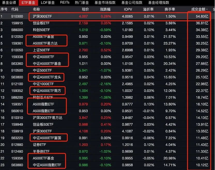 全市场今日放量成交较昨日增加100亿,其中,华泰柏瑞沪深300ETF成交额为54.83亿,易方达创业板ETF成交额36.81亿元,华夏科创50ETF以34.38亿元的成交额紧随其后。A500指数相关ETF集体成交额爆发,华夏、易方达、国泰、华泰柏瑞、广发、南方等旗下中证A500ETF单日成交额突破20亿。