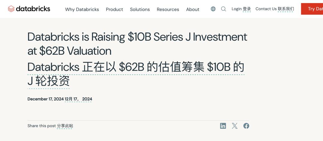 AI数据分析公司Databricks宣布其J轮融资目标为100亿美元(约合人民币728亿元),目前已完成86亿美元(约合人民币626亿元),超越了OpenAI在10月获得的65亿美元融资(约合人民币473亿元)。