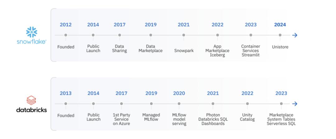Databricks和Snowflake是目前在统一云原生数据平台领域的两大竞争者。虽然两家公司成立相差仅一年,最初它们的产品是互补的。随着Databricks在查询性能上的提升,以及Snowflake逐步加入AI功能,两者的竞争逐渐加剧。