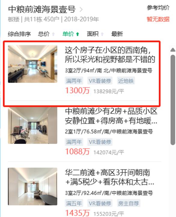 我去查了一下,网上房地产显示中粮前滩海景壹号还有一套1楼的没卖,近期小区的同户型低楼层的挂牌价差不多在1300万。