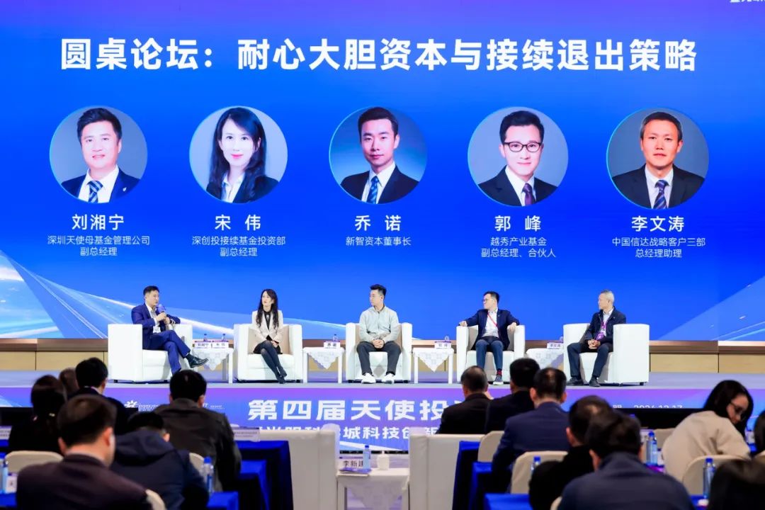 深天使副总经理刘湘宁主持了“耐心大胆资本与接续退出策略”圆桌论坛。深创投接续基金投资部副总经理宋伟,新智资本董事长乔诺,越秀产业基金副总经理、合伙人郭峰,中国信达战略客户三部总经理助理李文涛参与论坛。