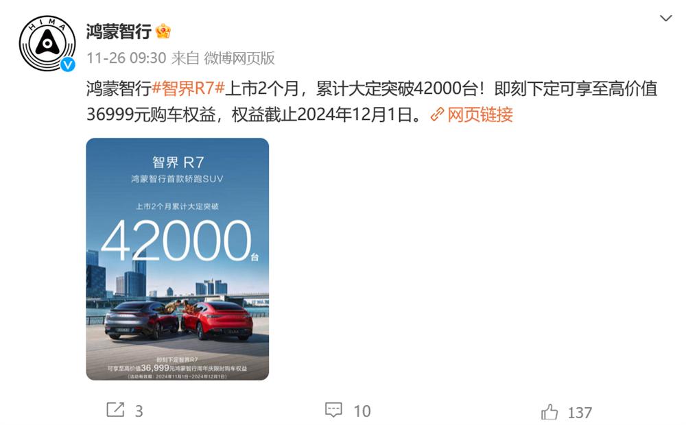 ▲智界R7上市2个月大定4.2万台