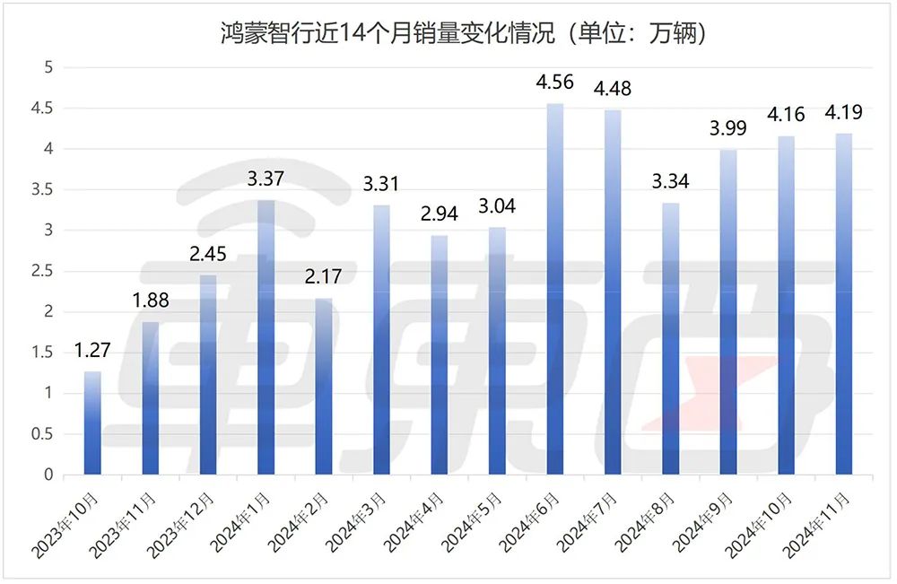 根据今年鸿蒙智行11月销量数据,11月鸿蒙智行全系交付新车4.19万辆,同比增长123%。