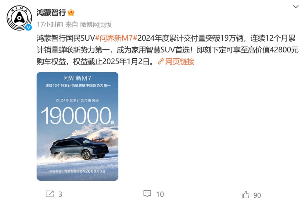▲问界新M7今年累计交付19万台