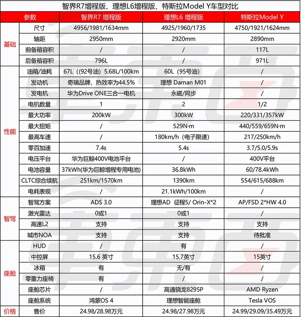 ▲智界R7、理想L6、特斯拉Model Y对比